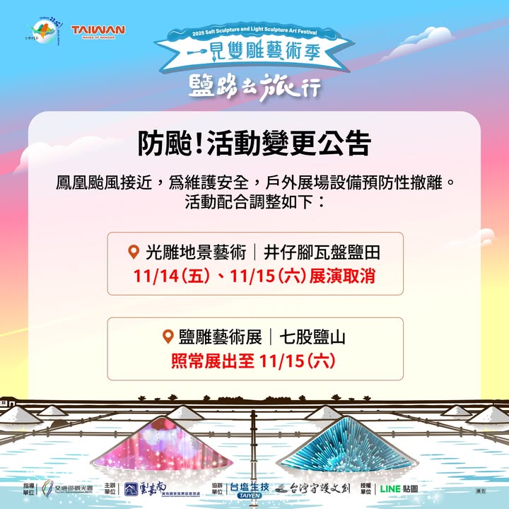 - 2025-11-11【防颱公告】鳳凰颱風接近,因應天候與防災作業,為顧及安全,我們將進行戶外展場設備預防性撤離,活動異動如下: 光雕地景藝術 @ 井仔腳瓦盤鹽田 11/14(五)、11/15(六)展演取消 鹽雕藝術展 @ 七股鹽山 持續開放至 11/15(六) 提醒大家留意最新公告、配合現場人員引導,並做好防颱準備。 謝謝體諒與支持。