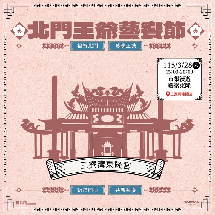 - 2026-03-16#北門王爺藝饗節 |市集漫遊.藝聚東隆北門王爺藝饗節六宮系列的壓軸活動來啦! 3月28我們在 玉勅代天府三寮灣東隆宮 (三寮灣東隆宮) 為大家準備了一整天從下午熱鬧到晚上的祈福 × 市集 × 音樂盛典, 讓你一次感受北門最有味道的春日祭典! 🛍【下午|市集漫遊 × 午後樂章】 廟埕市集登場! ✔ 在地美食 ✔ 文創手作 ✔ 特色選物攤位 ✔ 街頭藝人互動表演 最舒服的午後散步,最地方的北門生活感就在這裡 【晚上|藝聚東隆晚會】 夜晚進入活動最高潮!邀請多位人氣歌手輪番獻唱 陳孟賢 王星宇 余凱揚 凱崴樂團 晚會結合全國保生大帝聯誼辦桌,席位為信徒專區,未開放自由入座;民眾歡迎至觀賞區共襄盛舉 好歌連發、氣氛滿滿,這是最道地的庄頭音樂夜 【百廟聯誼 × 東隆宮信仰魅力】 三寮灣東隆宮長年為保生大帝聯誼重點廟宇, 信仰力量深厚、人情味最滿。 活動當晚更同步舉辦廟方盛大辦桌(內部聯誼), 讓現場氛圍更熱鬧、更具節慶感! 活動資訊 115/3/28(六) 市集|12:30 晚會|17:30 三寮灣東隆宮(臺南北門區) 北門王爺藝饗節|六宮系列活動 最終場! 免費參加! 快揪親朋好友,一起來三寮灣東隆宮, 逛市集、聽金曲、享受北門最溫度的廟會氛圍!