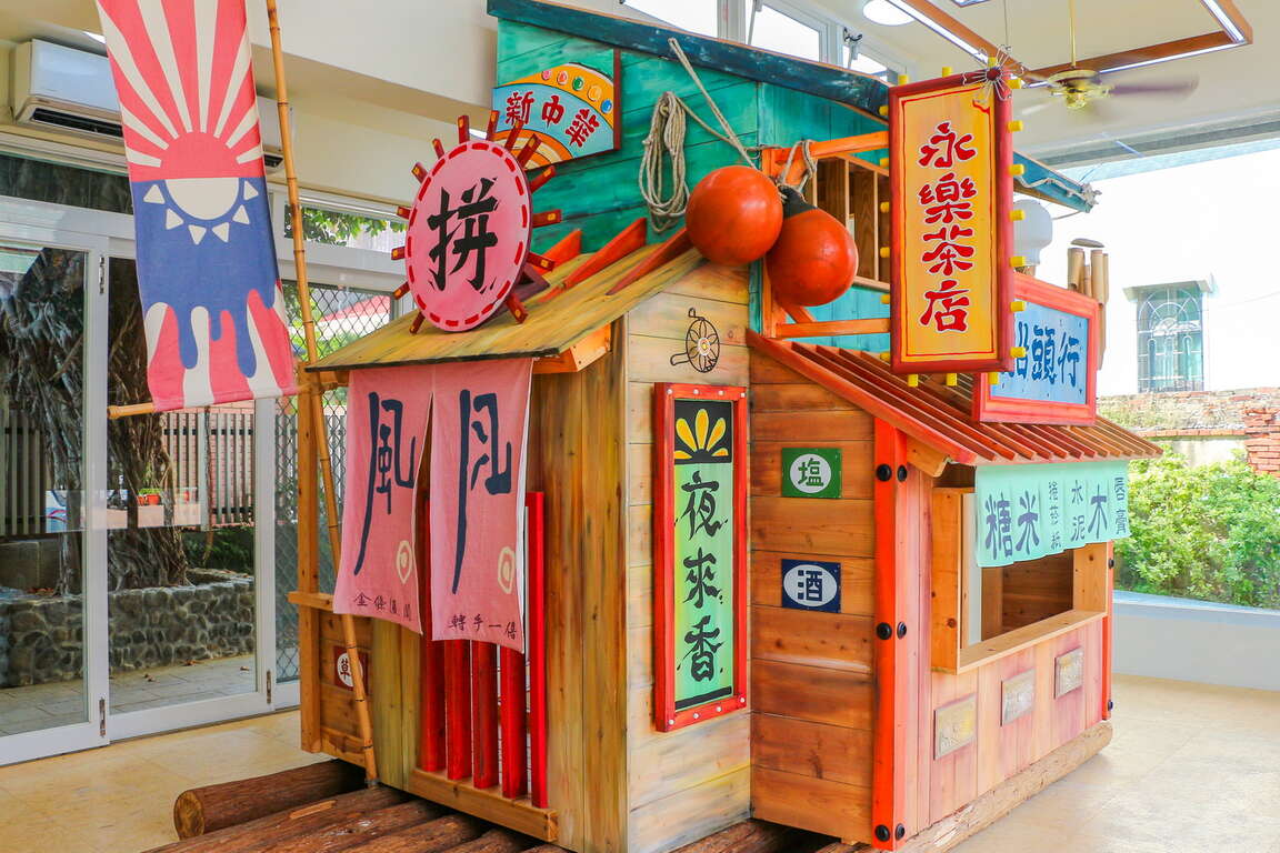 On the first floor of the Story House, paintings are used to illustrate the 400 years of historical changes in Budai, with one painting representing a colonial period, namely the prehistoric period of Taiwan, the Dutch/Koxinga period, the Qing Dynasty, the Japanese rule period, and the period after Taiwan's restoration, in which Budai and Chinese maritime transport flourished at the beginning of the restoration period, giving it the name of "Budai Little Shanghai". There is a children's reading room in the Story House, which was based on the prosperous boathouse back then, with tatami mats inside, so that the children can sit in the boathouse and read the picture books. The exterior is decorated with famous stores such as Yongle Tea Shop and Yilai Xiang, as well as rice and sugar, which were the most exported items at that time, highlighting the former glory of Budai.