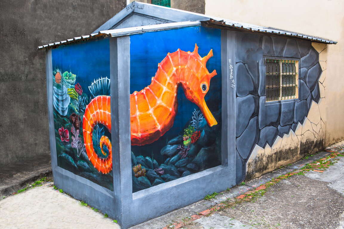 The childlike drawing style showcases the fishing village culture unique to the small Mashagou Fishing Village. There are also other paintings such as “Miao Miao Ai Ci Tu Tuo (Cat likes to eat narrow-barred Spanish mackerel), “He Ma Wan Yue (Hippo watching the moon)” and “Mao Zai Sai Yu (Cat drying the fish)”. Be it the octopus or the karasumi, these symbolic productions of the fishing village have all become the main characters of the 3D paintings. The creator of these paintings, Master Ceng Jing Chen, has even thoughtfully indicated the best place to take photographs, making it easy for visitors to take great photographs.
