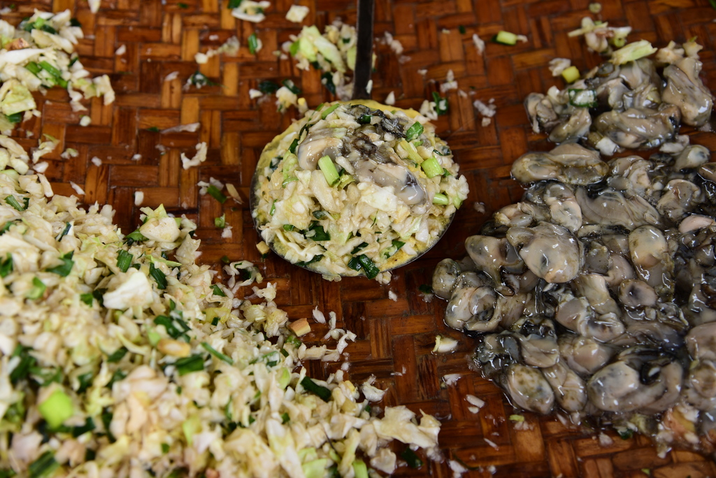The batter for “Xiu Bi Oyster Fritter” is unique as it uses pure soya flour, without any other ingredients, while the filling consists of oyster, cabbage, chives, and shredded ginger. Before opening the store, the owner makes the batter by mixing soy flour and water and prepares the filling by mixing chopped cabbage, chives and ginger with seasoning. When a customer orders a fritter, the owner applies a layer of powder on the oyster fritter and fills it with the filling. She then applies another layer of powder and deep fries the fritter until it is golden and rich in the aroma of oysters. The fritter is then cut and served. The oysters used come from the neighboring village, Lu Zhu Gou, which is known for its oyster produceproduction. The oysters are large, fresh and opened on the spot, while the seasoning is specially formulated with Chinese herbs. As a result, “Xiu Bi Oyster Fritter” is crispy and refreshingly sweet, enticing the customer for another bite.