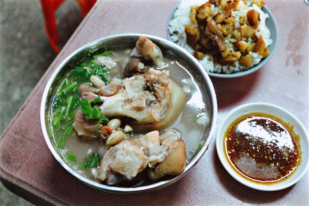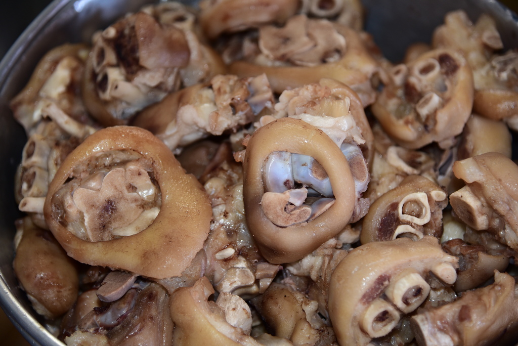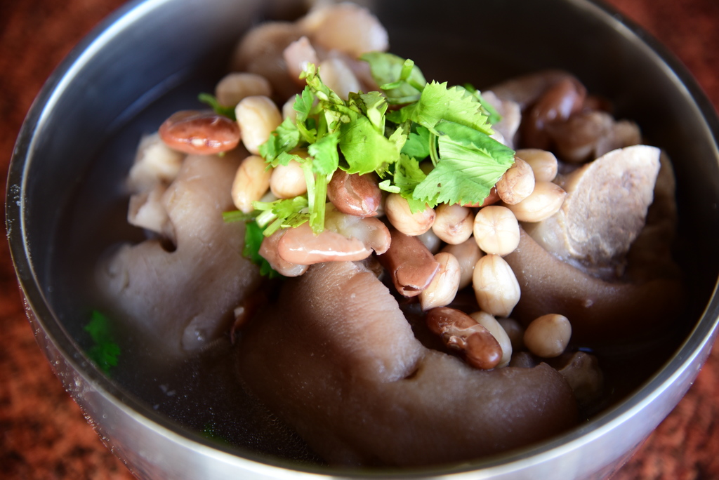 A stall of peanuts and pork knuckles drove the economic activity of Guoxing bridge south; this is the economic miracle achieved by National Treasure Peanuts and Pork Knuckles. The Peanuts and Pork Knuckles use peanuts, runner beans and pork knuckles. Purchased pork knuckle chops are first washed, blanched, drained and set aside. A new pot of water is prepared, added in the previously blanched pork knuckles, as well as the peanuts and runner beans, and boiled for more than 2 hours. The just cooked peanuts and pork knuckles have a very rich flavor, so it is diluted with boiling water before adding seasoning and served in a bowl with coriander. There are no whole chunks of pork, just the knuckles, so customers can fully enjoy the fun of nipping pork knuckles.