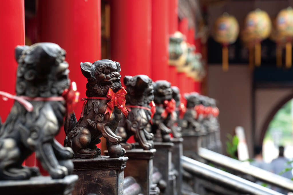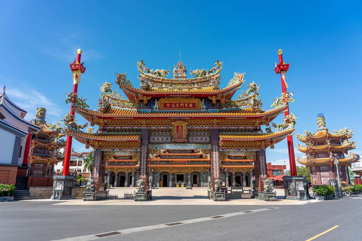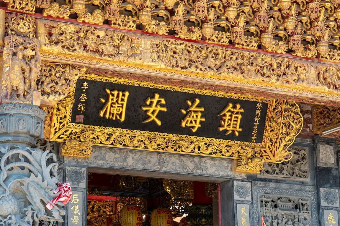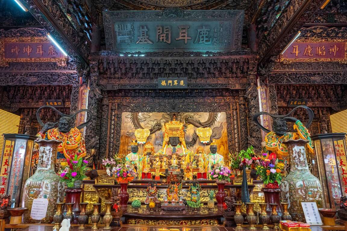 昔の様式をもとに造られた宮殿式建築は、堂々とそびえ、厳かなムードをかもしています。廟内に祀られる「鹿耳門媽」像は、顔から慈悲と威厳がにじみ出ており、中国の貴重な千年萱芝木材である「紫檀」に精巧な彫刻を施して作られています。また様々な変遷を経てきた旧港道には現在カキ棚が立ち並び、昔の様子が偲ばれます。