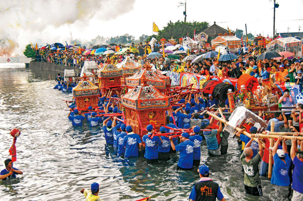 布袋新塭嘉応廟の「衝水路、迎客王」は台湾でも珍しい宗教イベント。毎年旧暦3月27日、山を巡視する7尊の王爺、海を巡視する13尊の王爺、合計20尊の「客王」が、布袋鎮新塭の沖合に停泊した無形の王船に集合し、王船が満ち潮を利して新塭の地に入って客人となります。嘉応廟に祀られている尹王爺と九龍三公は、地主の義に報いるため、毎年この日になると、付近の南鯤鯓旧三王、北港朝天宮糖郊媽、朴子配天宮三媽といった神像を招待し、海に入って出迎えます。数十台の神輿が海に入って神々を迎える、これが「衝水路、迎客王」の風習の由来です。