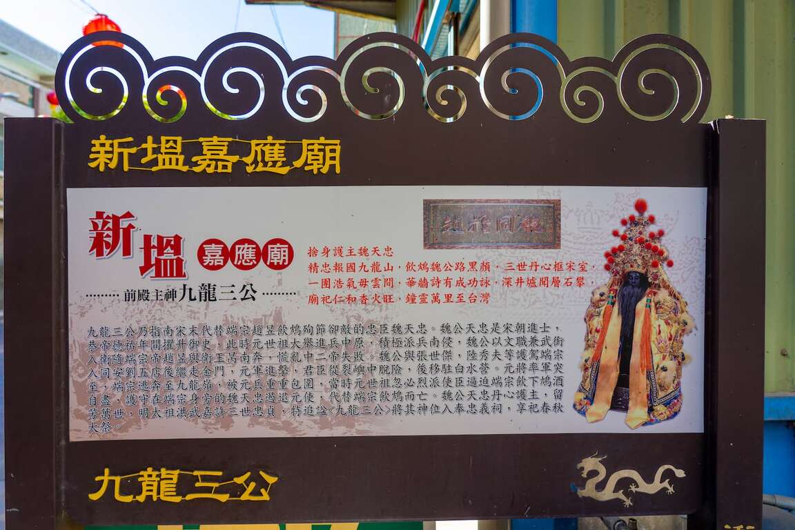 新塭にある嘉応廟も漁民が漁の安全を祈る信仰の中心です。廟宇内の主神は九龍三公王爺であり、三公とは南宋末の忠臣魏天忠、その父である魏国佐、祖父の魏了翁の三人。