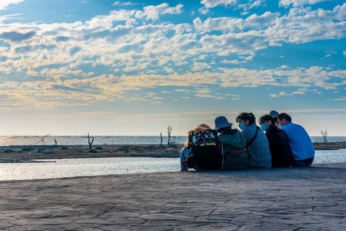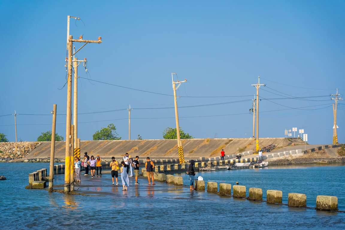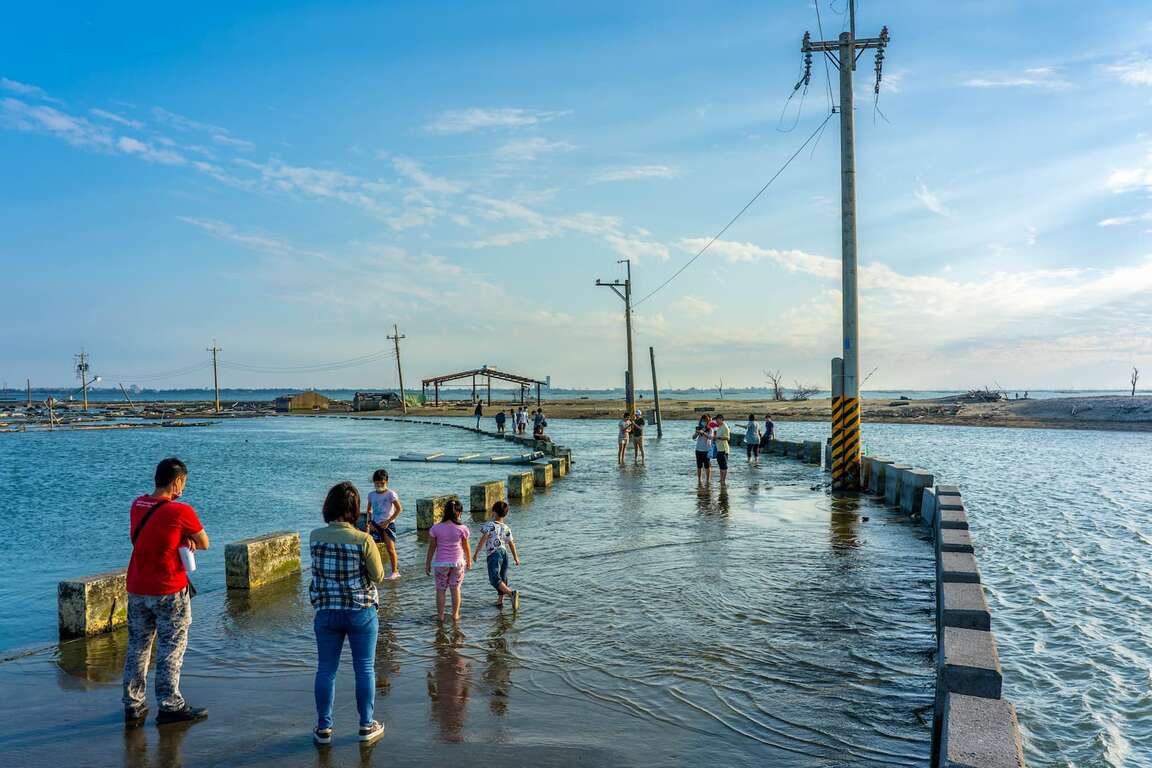 退潮時浮現的沙灘,大型裝置藝術充滿特色