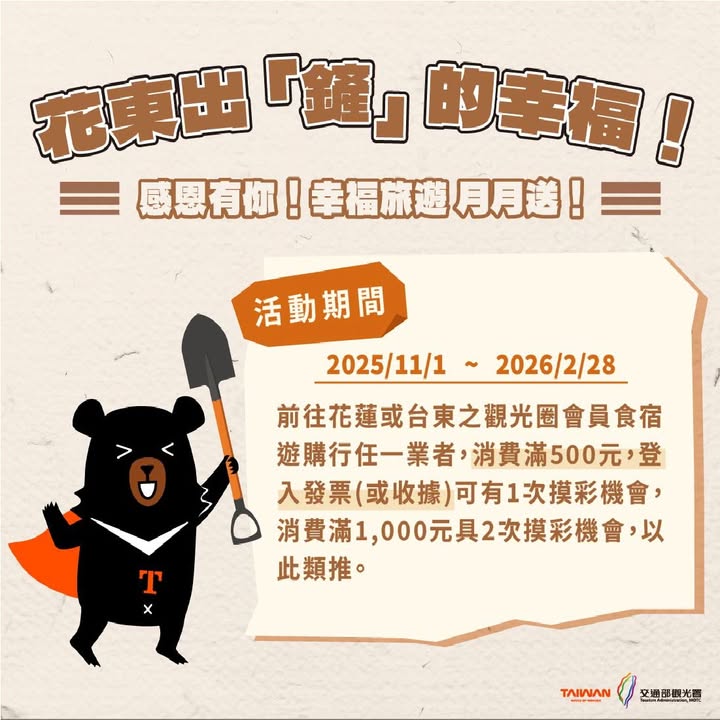 - #山海同盟|西濱挺花東讓我們沿著海岸出發,用腳步串起山與海的約定 花蓮、台東的幸福旅程 現在不只回憶滿滿~還有機會把好禮帶回家! 活動期間內到 #花東觀光圈 任一會員業者 「食・宿・遊・購・行」消費 滿 500元 登入發票(或收據),享1次摸彩機會 滿1000元 享2次摸彩機會,以此類推 活動時間|2025/11/1-2026/2/28 抽獎時間| .月月抽:12/1、1/1、2/1、3/1 .加碼「鏟出幸福獎」:2026/3/1(全體消費者參加) 獎項好康: 月月抽|花東住宿券、3C產品、花東大禮包等 加碼大獎|Toyota Yaris Cross享樂版(市價約71萬) 金豆3錢、住宿券、3C好禮、iPhone17、台糖住宿券等 【旅宿1+1 幸福專案】 雙人兩晚,一次玩遍花東兩地 專案期間|2025/11/1-2026/2/28 優惠價: .旅館套裝 NT$4,999(兩人兩晚) .民宿套裝 NT$3,800(兩人兩晚) 小提醒: ✔ 限跨旅館或跨民宿兩晚連用(不可拆開) ✔ 週日~週五適用,假日不適用 ✔ 若遇颱風或交通中斷,可延用或保留三個月內使用 更多參加店家及優惠持續更新中! 詳細活動辦法請上 花東縱谷國家風景區管理處 官網 全臺各風景管理處齊心響應,用旅行支持花東,讓幸福再度綻放 #山海同盟 #旅遊好康 #幸福旅程 #從海玩到山 #一起挺花東 #花東出鏟的幸福 #旅宿1加1幸福專案 #以旅之名為花東加油 #海線相挺2025-11-01