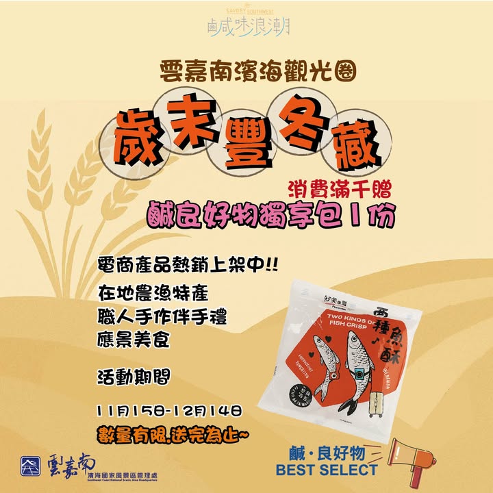 - 雲嘉南濱海觀光圈|#秋收冬藏雲嘉南濱海觀光圈又有好康要送給大家啦~ 有人以柴火炒出土地香氣、 有人讓海風吹熟幸福滋味—— 這個冬藏時節,甘苦人與職人們都在用心守護雲嘉南的美好。 消費滿千贈「鹹良好物獨享包」1份 在地農漁特產 職人手工伴手禮 應景節慶美食 活動時間:11/15 – 12/14 數量有限,送完為止! 電商產品熱銷上架中 立即行動,把雲嘉南的海味與秋收的幸福帶回家! #雲嘉南濱海觀光圈 #歲末豐冬藏 #滿千送好禮 #鹹良好物 #地方創生 #友善農業 #職人精神 #濱海風土2025-11-09