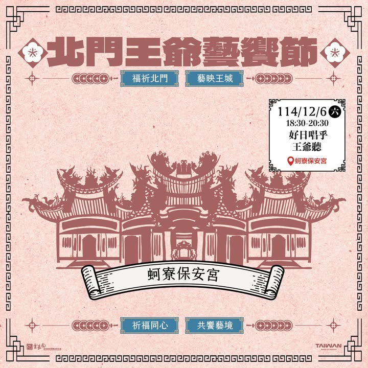 - 還沒來#北門王爺藝饗節 嗎?2026 年還有 最後 4 場活動 把時間留給北門,把好運帶回家 現在就加入你的行事曆 2026/1/24六 15:30-17:30 神廟大馬戲 ●井仔腳興安宮 2026/2/20五 14:30-17:30 樂聲賀新春 ●井仔腳瀬東泰安宮 2026/3/7六 15:30-17:20 掌中傳藝戲偶傳情 ●北門永隆宮 2026/3/28六 15:00-20:00 市集漫遊藝聚東隆 ●三寮灣東隆宮 #北門王爺藝饗節 #2026 #王爺保平安 #北門走春2025-12-17