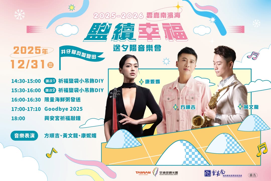 - 讓我們送別 2025 的最後一道夕陽迎向 2026 的幸福開始 年末最溫柔的一天,用音樂、祈福與滿滿祝福,和 2025 好好說再見 2025–2026 雲嘉南濱海|鹽續幸福·送夕陽音樂會 地點:井仔腳瓦盤鹽田 時間:12/31(三)14:30-18:00 當日精彩活動一次看 音樂演出 方順吉、黃文龍:薩克斯風演奏 康妮媚:小提琴演奏 祈福鹽袋吊飾免費DIY #限量100位 熱騰騰海鮮粥免費發送(數量有限)#在地限定美食 響應環保,請自備環保餐具(自備餐具贈送小禮物~) 興安宮祈福敲鐘 參與即可獲得~鹽王爺餅乾、馬年吊飾鑰匙圈、發財金等禮品 當日限定體驗|免費兌換透明明信片 現場設有 臨時郵局 ✔ 可直接現場寄出 ✔ 專屬當日郵戳 ✔ 活動限定透卡明信片,夕陽映在字裡行間,收藏或寄送都超有紀念價值 17:00 一起說聲 Goodbye 2025 18:00 興安宮祈福敲鐘,迎接 2026 的第一份祝福 今年的最後一個傍晚 讓夕陽替我們留住回憶 用祝福迎接嶄新的 2026 帶著家人朋友,一起來雲嘉南 送別 2025 的夕陽,迎向 2026 的幸福吧!2025-12-25