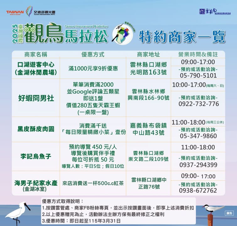 - 還沒報名嗎? 今年雲嘉南濱海候鳥季超精彩!你看過多少種了?🪶黑面琵鷺已大量現身雲嘉南濱海,搭配小辮鴴、白琵鷺與各式水鳥輪番登場,一年中鳥況最精彩的時候,錯過這一季,就要再等一年 如果你一直想賞鳥、卻不知道怎麼開始, 「定點定時導覽」最適合你——不用找路、不怕看不懂,跟著專業導覽輕鬆走進濕地 【好康加碼】 只要按讚 雲嘉南,好好玩!!!(雲嘉南濱海風景區) 以及特約商家臉書專頁即享各式不同優惠(特約商家名單及優惠折扣請見圖) 一起來一場賞鳥、又能體驗在地特色的小旅行! 優惠方式取得說明: 1. 按讚雲管處、商家FB粉絲專頁,並出示按讚畫面後,即享上述消費折扣 2. 以上優惠贈完為止,活動辦法主辦方保有最中修正之權利 3. 優惠時間:即日起至115年3月31日 |活動名稱:與飛羽共舞-雲嘉南濱海賞鳥定點定時導覽 |活動時間:2025 年 12 月 – 2026 年 3 月 | 09:00–12:00 (每場次以 20 人為上限,詳細日期請至報名網站查詢) |活動地點:雲嘉南濱海濕地區 |報名連結: https://bao-ming.com/eb/content/6796#32012 |費用:免費! |對象:對雲嘉南濱海永續生態旅遊和賞鳥活動有興趣的朋友都可以報名 ( 12 歲以下兒童需家長陪同、未成年需家長同意) #雲嘉南濱海國家風景區 #賞鳥導覽 #候鳥季 #生態旅行 #慢遊雲嘉南 #自然觀察 #秋日濕地 #雲嘉南旅遊2025-12-22