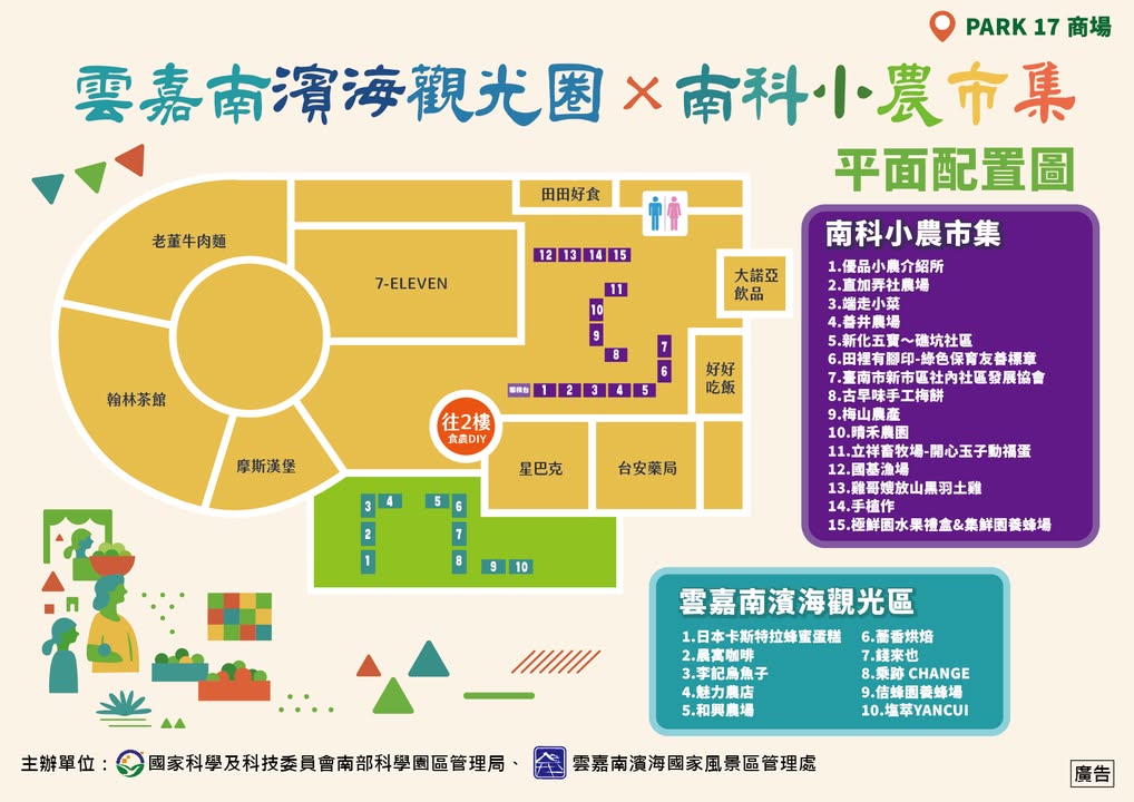- 雲嘉南觀光圈市集 11/29 就在南科 Park17 商場!本次由雲嘉南濱海國家風景區管理處 × 南科管理局共同合作,不只帶來南科在地的特產、生鮮蔬果,更集結雲嘉南觀光圈最具代表性的品牌與商品——在地特色遊程、烏魚子、咖啡、輕食通通找得到! 歡迎大家一起來南科探索我們的魅力市集唷 活動資訊 時間:114/11/29–30|10:30–16:30 (★11/29為雲嘉南觀光圈限定活動,共10家業者參與) 地點:南科 Park17 商場(臺南市新市區南科三路17號) 最夯市集 25攤在地特色攤位,美食、選物、手作一次逛好逛滿! 食農 DIY 體驗 從玩中學,認識鹹良好物、動手創作最有趣 商圈滿額送農遊券 當月於 Park17 商場或社區中心,累計消費滿 500 元,可兌換 50 元農遊券1張! 現場加碼抽好禮 活動期間累積消費滿 500元,即可參加抽獎 多款雲嘉南觀光圈好物等你帶回家2025-11-18