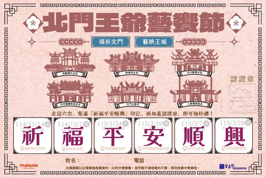 - #北門王爺藝饗節|祈福集章遊開跑這個冬季,一起走訪北門六大宮廟,邊旅行、邊祈福 拿起你的「祈福集章卡」,集滿六宮印章,再加上認證章投入摸彩箱,就有機會把黃金、iPhone、Switch 等好禮帶回家! 跟著足跡巡遊北門,讓旅程更添祝福,也更有儀式感 活動期間 114/11/14(五)-115/3/10(二) 祈福怎麼玩? Step 1|索取集章卡 北門遊客中心與六大宮廟免費索取,#每人限領一張 Step 2|走訪六宮集章 六大宮廟皆設集章台,自行蓋章即可 (南鯤鯓代天府、蚵寮保安宮、北門永隆宮、井仔腳瀨東泰安宮、井仔腳興安宮、三寮灣東隆宮) Step 3|加蓋認證章 至北門王爺藝饗節活動服務台或 #北門遊客中心,由工作人員核對後加蓋認證鋼印 ※ 未蓋認證章者 不具抽獎資格 Step 4|投入摸彩箱 完成六宮章+認證章(共7枚)即可投遞 地點:#北門遊客中心、北門王爺藝饗節活動現場服務台 ※ 每人限投一張,請務必填寫正確聯絡資訊,重複投遞將取消參賽資格※ 獎項搶先看 王爺金賞獎|黃金一台兩 × 1 平安祈福獎|iPhone 17(256GB) × 1 吉慶好運獎|Nintendo Switch 2 × 3 六宮藝旅獎|雙人房住宿券 × 10 祥瑞幸運獎|超商商品卡 $1,000 × 7 福氣加持獎|王爺加持好禮 × 10 抽獎資訊 公布:115/3/18(三) 公告於官網 &本粉專 雲嘉南,好好玩!!!(雲嘉南濱海風景區) 獲獎者將以電話通知 想祈福、想旅行、想集章的你,北門王爺藝饗節,一次滿足 這個冬天,就從北門開始,收集祝福、把好運帶回家2025-11-16