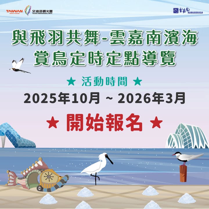 - #與飛羽共舞|雲嘉南濱海賞鳥定點定時導覽這個秋天,讓我們走進嘉義南布袋濕地園區,尋找季節遷徙的身影 白鷺成群掠過水面、反嘴鴴在潮間帶輕巧翻飛——在專業導覽的帶領下,認識這片滿載生命力的濕地寶藏 誠摯邀請你,以最貼近自然的方式,與飛羽共享一段靜謐而豐富的晨間旅程 導覽時間︱09:00-12:00(每場限額20人,詳細日期請至報名網站查詢) 費用|免費 對象|凡對雲嘉南濱海永續生態旅遊、觀鳥活動有興趣者皆可報名 (12歲以下兒童需家長陪同、未成年需家長同意) 報名連結:https://bao-ming.com/eb/content/6796#32012 活動小提醒 請穿著輕便服裝與鞋子,以利行動 記得攜帶個人水瓶,隨時補水 活動已為參加者投保公共意外責任險 #雲嘉南濱海國家風景區 #賞鳥導覽 #候鳥季 #生態旅行 #慢遊雲嘉南 #自然觀察 #秋日濕地 #嘉義旅遊2025-11-15