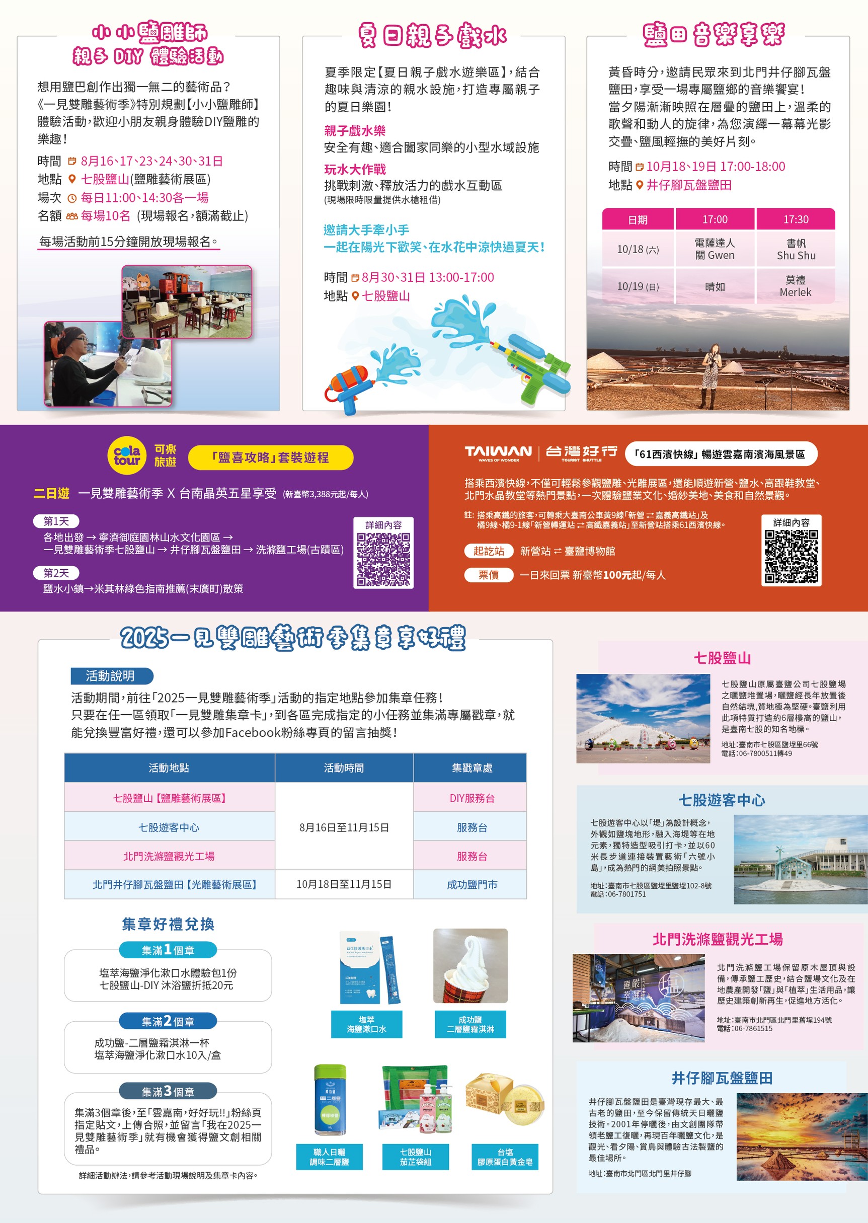 「一見雙雕藝術季」活動是南臺灣每年暑假期間盛大的雕塑藝術展演活動,展出以雲嘉南濱海在地素材,包括鹽及其他材料,所雕塑創作的藝術品,「一見雙雕藝術季」的重要雕塑主角–鹽雕展,也是目前臺灣獨一無二的展示,藉由鹽雕結合其他不同材料的雕塑作品,提供遊客每年不同感受的一見雙雕體驗,並搭配其他主題系列活動,吸引家庭、親子等全國遊客到雲嘉南濱海戶外旅遊。
