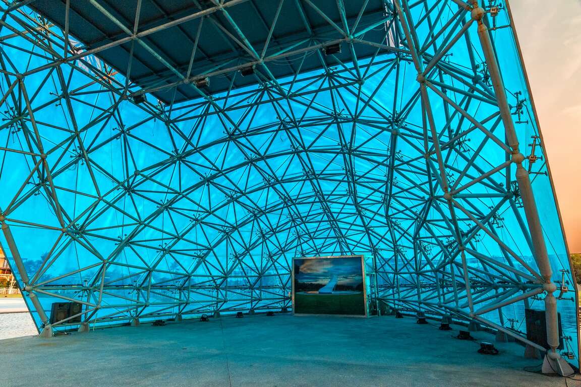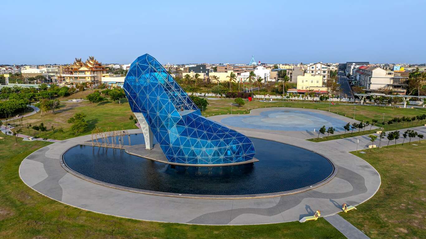 矗立於水面造景上的高跟鞋教堂