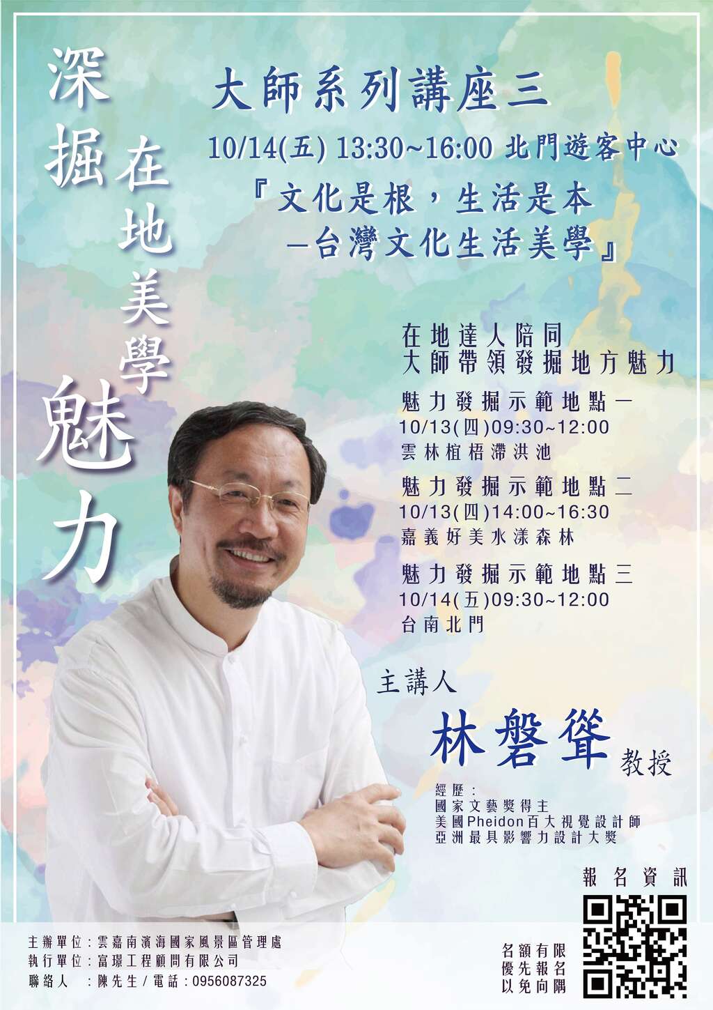 由交通部觀光局雲嘉南濱海國家風景區管理處(以下稱雲嘉南管理處)為精進「雲嘉南濱海觀光圈」業者服務觀念,規劃三場大師系列講座,繼8月10日首部曲蘇國垚大師開講「B&B 服務核心價值」,9月21日至23日二部曲薰衣草森林王村煌董事長開講「企業診斷WHY & HOW TO DO?」及其團隊執行五場次實地案例示範診斷,廣受好評後,第三場大師講座(三部曲)由國家文藝獎得主-林磐聳教授於10月14日下午2時00分於北門遊客中心開講,更先行精心規劃三場次魅力發掘示範點,商請在地達人陪同,由大師帶領大家探尋在地美學魅力,希望藉由頂尖大師的眼光及經驗,提供雲嘉南濱海地區產業有更具體亮點的場域呈現。