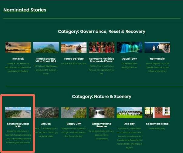 「綠色目的地故事獎」(The Green Destinations Story Awards)為前年度獲選之全球百大目的地故事獎(Top 100 Destination Sustainability Stories)的100個故事裡,從六大類別中挑選各6件最具啟發性、永續性旅遊措施的故事入圍,將於3月7日全球最大國際旅展- ITB Berlin柏林國際旅展從入圍者中公布獲獎名單。