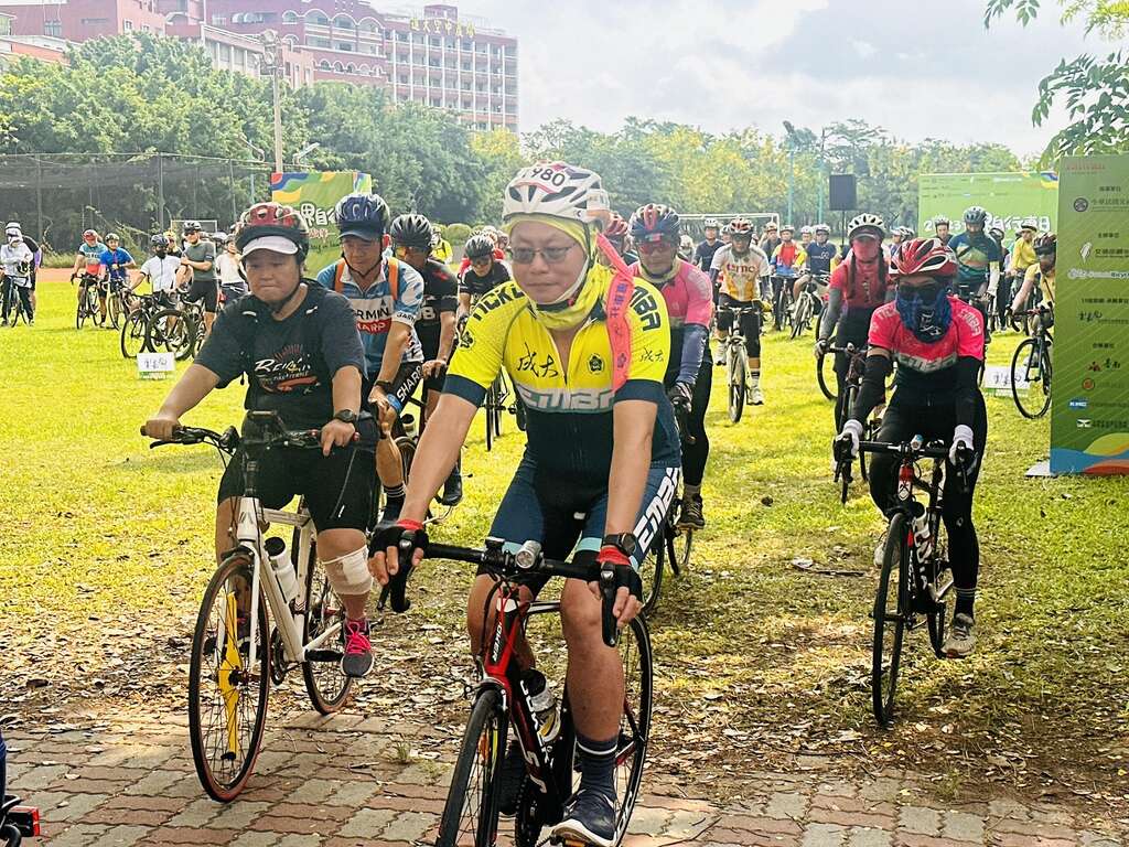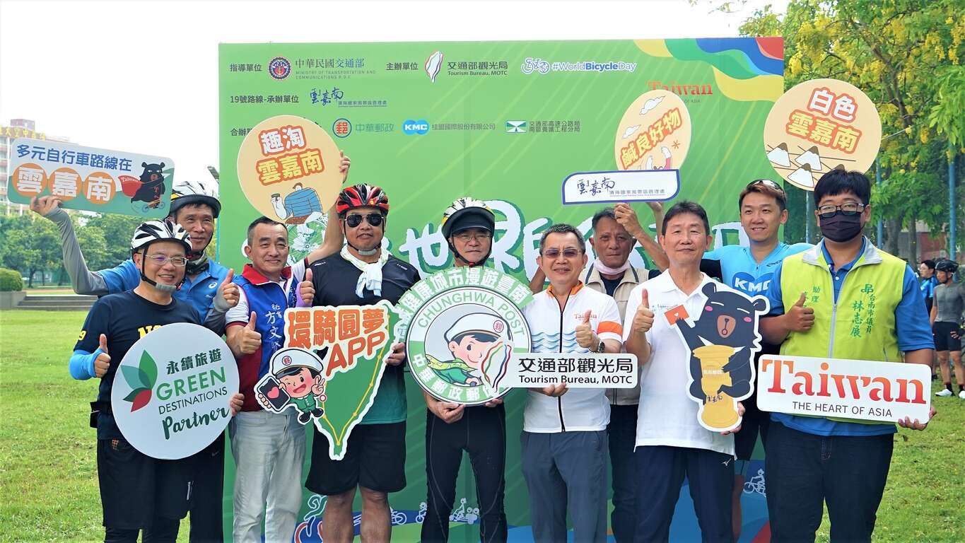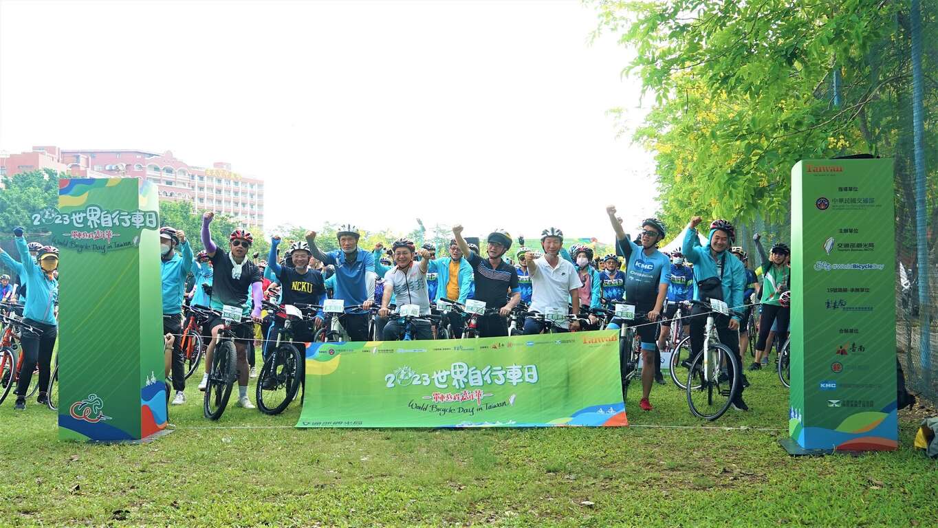 今(3)日是聯合國訂立的世界自行車日,交通部為響應綠色旅遊,舉辦「2023世界自行車日-騎遊環台活動」,以自行車環島一號線及相關環支線劃分成45條路線,於上午9時全國同時啟程,透過「環騎圓夢APP」以軌跡圖拼劃出臺灣輪廓,象徵全台團結共推自行車旅遊的目標。其中第19號路線由雲嘉南濱海國家風景區管理處(以下簡稱雲嘉南管理處)承辦,臺南市政府由觀光旅遊局盧振義主任秘書率隊,隊伍中並有中華郵政股份有限公司江瑞堂總經理率臺南郵局黃良江局長等同仁、交通部高速公路局南區養護工程分局楊熾宗分局長率各段長等同仁,還有桂盟企業股份有限公司等單位共襄盛舉,今日活動共計214人騎乘,自遠東科技大學出發,行經台39線長達17.4公里,抵達歸仁十路及武當路交叉路口終點。