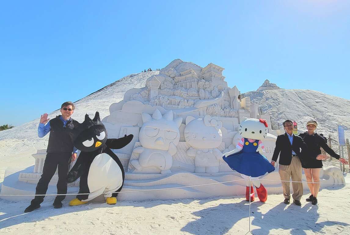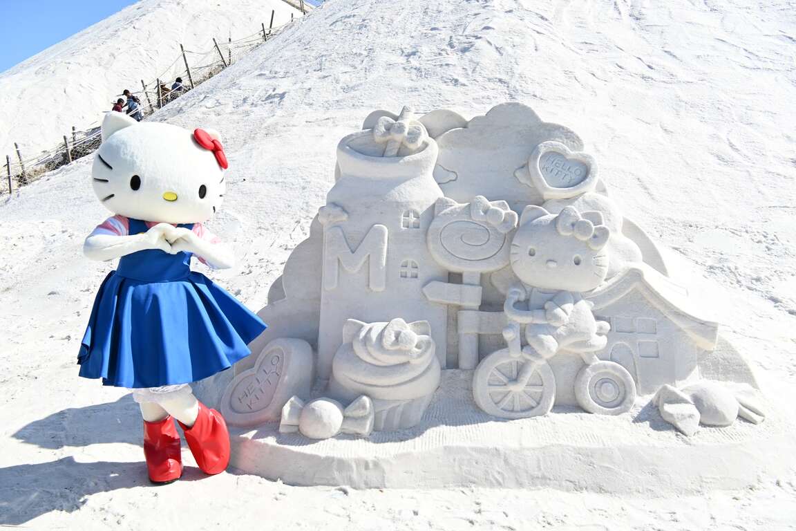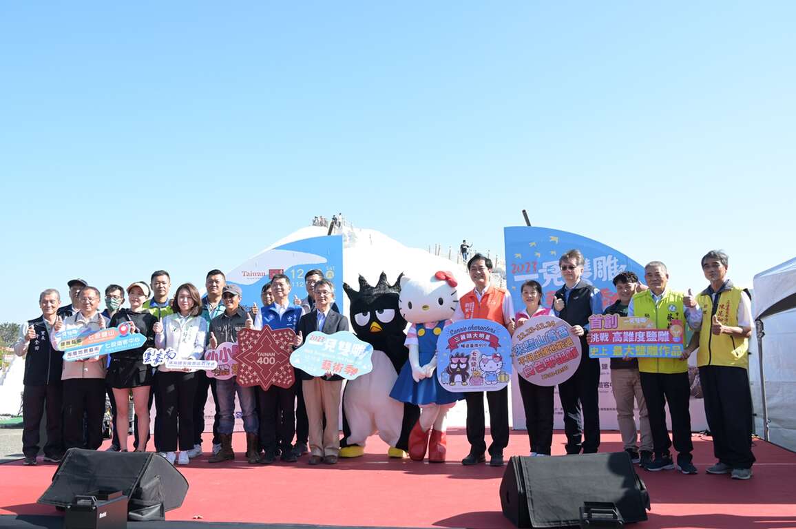 「2023一見雙雕藝術季」今(16)日起在七股鹽山及七股遊客中心盛大開幕展出,為歡慶臺南400,交通部觀光署雲嘉南濱海國家風景區管理處(以下稱雲嘉南管理處)特別邀請三麗鷗三大明星:Hello Kitty、酷企鵝、蛋黃哥,一同齊聚臺南來慶生。邁入第12年的「一見雙雕藝術季」,配合2024台灣燈會在臺南,首度於冬季舉辦,展期自12月16日至明年3月10日,橫跨聖誕節、新春與元宵等重大節日,邀請大家跟著三麗鷗大明星萌翻全場,體驗雲嘉南幸福的白色浪漫氛圍。