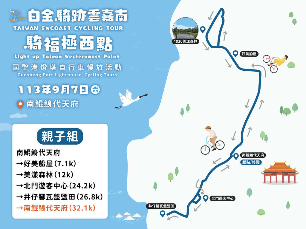 為了滿足不同車友族群,無論想挑戰自我,或是想流汗健身,還是只想吹吹風、散散心,闔家出遊的民眾們,雲嘉南風管處推出3條不同的路線,90公里(騎福組)一日拜訪2處濱海重要信仰中心:南鯤鯓代天府、鹿耳門聖母廟,並前往極西點國聖港燈塔朝聖,絕對是祈福的最佳選擇;50公里(騎跡組)路線,沿途瀏覽濱海特色白金風光,一次收集水晶教堂、井仔腳瓦盤鹽田、青鯤鯓扇形鹽田、七股遊客中心6號小島等景點;而最短路線30公里(親子組),則是漫遊布袋「好美船屋」,進入浪漫又美麗的1920美漾森林,還有親子DIY體驗活動,最適合親子一同出遊!