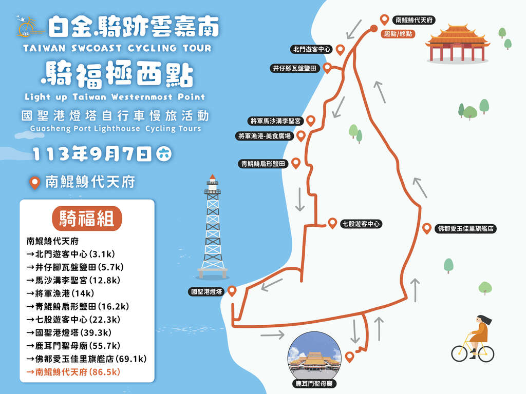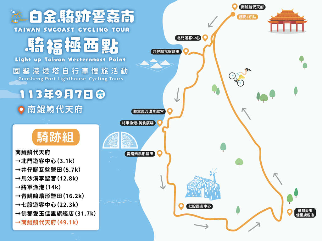 交通部觀光署雲嘉南濱海國家風景區管理處(以下簡稱雲嘉南風管處)將於今年9月7日(六),在台灣王爺總廟南鯤鯓代天府舉辦年度自行車活動「騎福極西點」。活動以雲嘉南濱海地區的主要信仰文化為主題,結合王爺及媽祖兩大信仰,從南鯤鯓代天府出發,一路騎經濱海各經典景點,前往台灣本島極西點國聖港燈塔,然後到訪建築雄偉華麗,有台版紫禁城之稱的正統鹿耳門聖母廟,再騎回南鯤鯓代天府。雲嘉南風管處號召全國騎士們,來趟極西之旅,一起騎車、祈福,同時飽覽雲嘉南濱海的美麗風光。自即日起,在伊貝特報名網上開放報名,歡迎喜歡自行車旅遊的朋友們,呼朋引伴來報名,一起騎福雲嘉南!