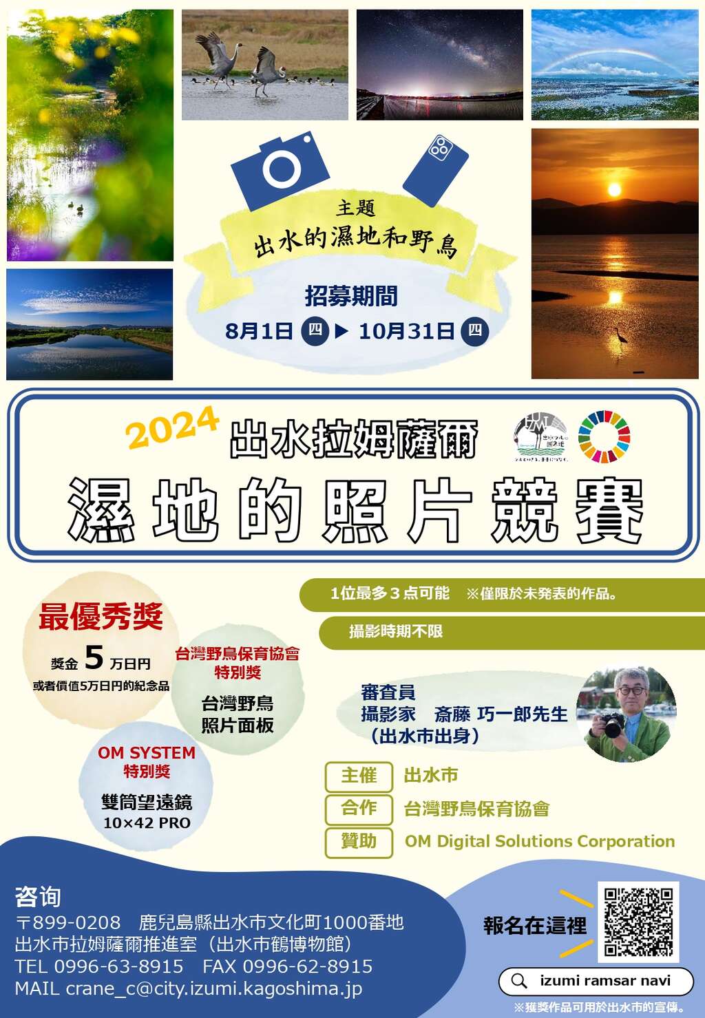 日本鹿兒島出水市因保有豐富的生態環境,以鶴的棲息地舉世聞名,歷年吸引大批賞鳥愛好者前往朝聖與攝影。今年出水市舉辦攝影比賽,由台灣野鳥保育協會協辦,攝影主題訂為「出水市的濕地與野鳥」,攝影作品需在出水市內拍攝完成,徵件時間即日起至2024年10月31日止,最高獎項為Olympus光學公司贊助的日幣5萬元(或等值獎品),獲選作品將會在出水市鶴博物館展出,歡迎台灣民眾踴躍報名,一起架構台日合作的友誼橋梁。
