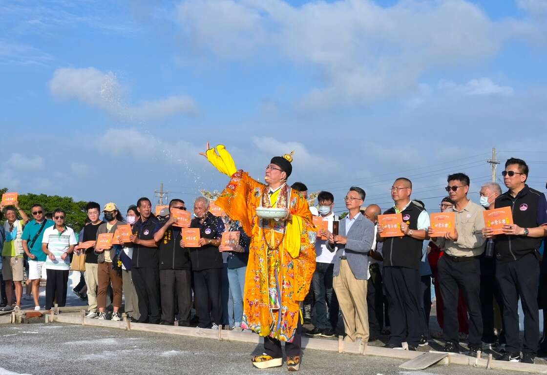 今日活動尾聲下午3時,「謝鹽儀式」在井仔腳瓦盤鹽田舉行,由交通部觀光雲嘉南濱海國家風景區管理處(以下簡稱雲嘉南管理處)處長許宗民、南鯤鯓代天府總幹事侯賢名、台灣守護文創公司董事長陳仁昌及晉基建設董事長廖淑芬等貴賓出席,現場也聚集許多民眾一起參與感恩的儀式,由吳文進大法師主持返本還原儀式,帶領主禮官及百位民眾一起將鹽撒回鹽田、回歸大海,為2024鯤鯓王平安鹽祭劃下完美的句點。