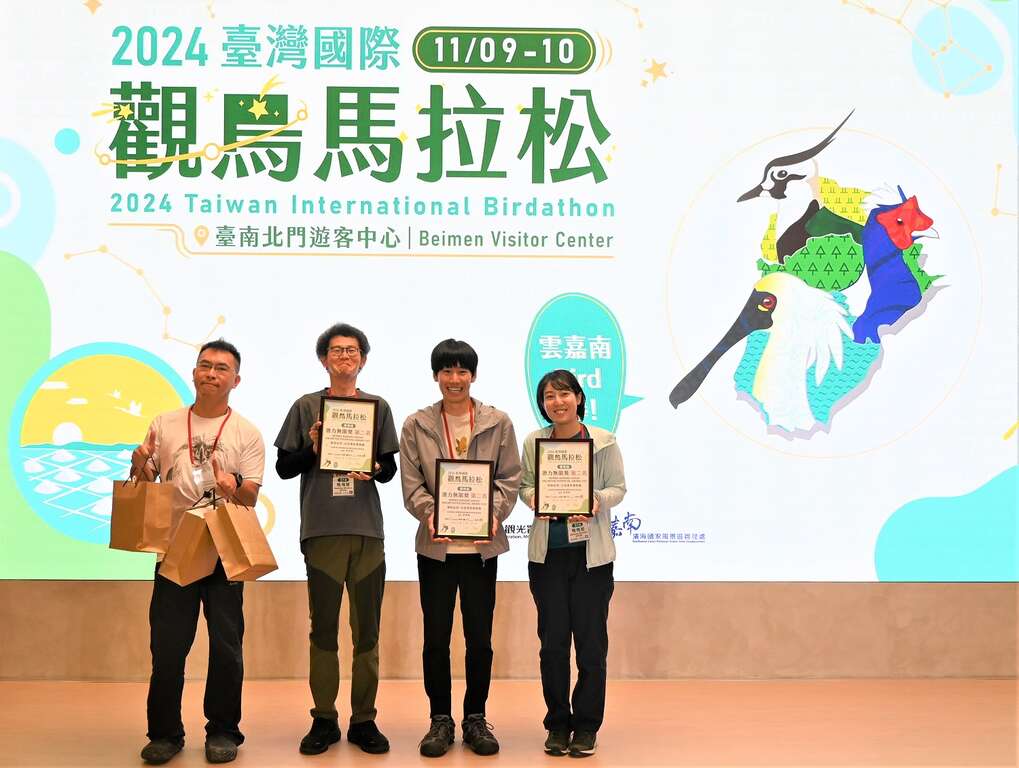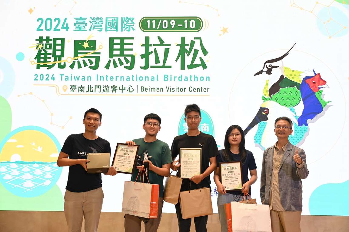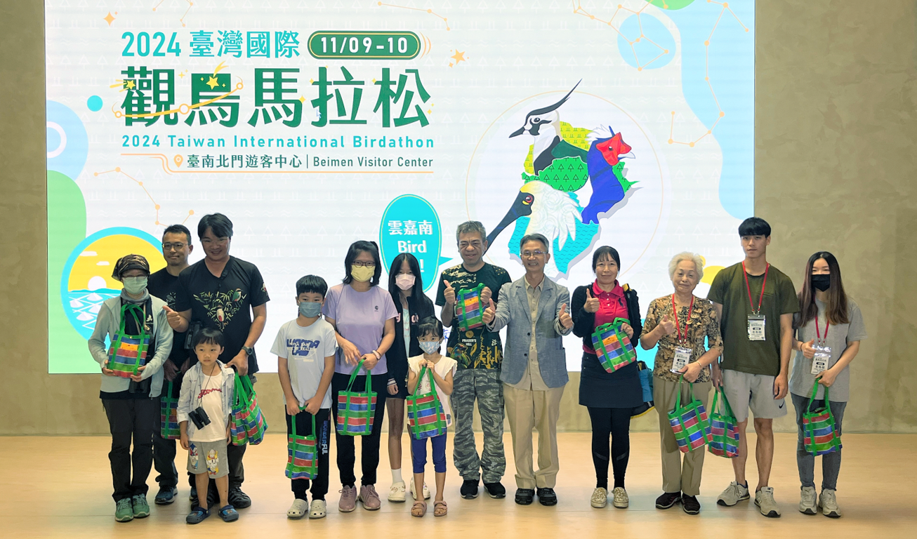 由交通部觀光署雲嘉南濱海國家風景區管理處(以下簡稱雲嘉南管理處)主辦的第12屆「2024臺灣國際觀鳥馬拉松」大賽,經過近百位參賽者24小時的努力下,今(10)日陳亭妃立法委員辦公室秘書李麗娟、賴惠員立法委員辦公室秘書周麗娜及陳龍興、雲嘉南管理處許宗民處長蒞臨閉幕典禮,本次活動經鳥友們24小時馬拉松式的觀察,透過3位專業評審老師審查,總計本次活動共觀察到201種鳥種,其中包含台灣特有鳥種21種。各組第1名觀察到的鳥種分別為老鳥組135種、送子鳥組119種、慢飛組69種,最佳攝影獎則經評審老師們共同挑選,由送子鳥組親子家庭拍攝台南市鳥水雉覓食的照片拿下。