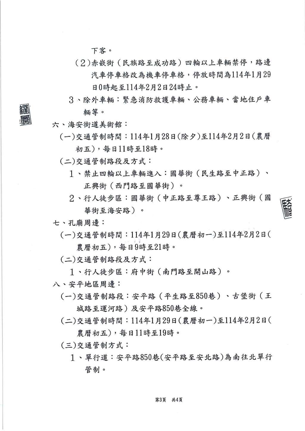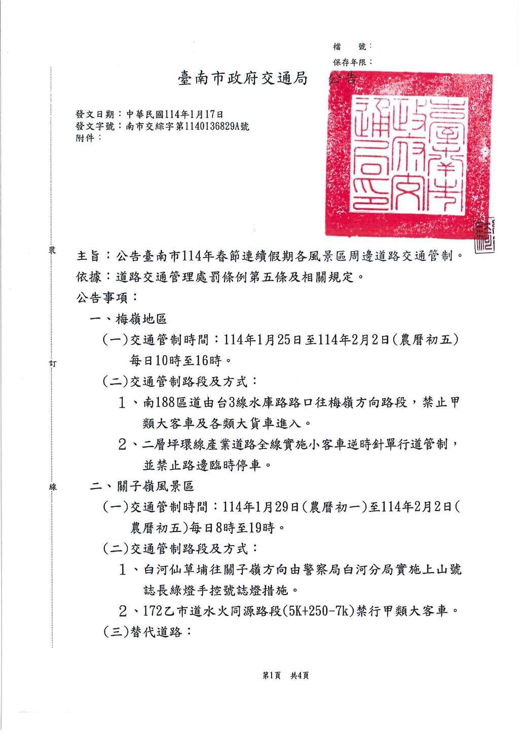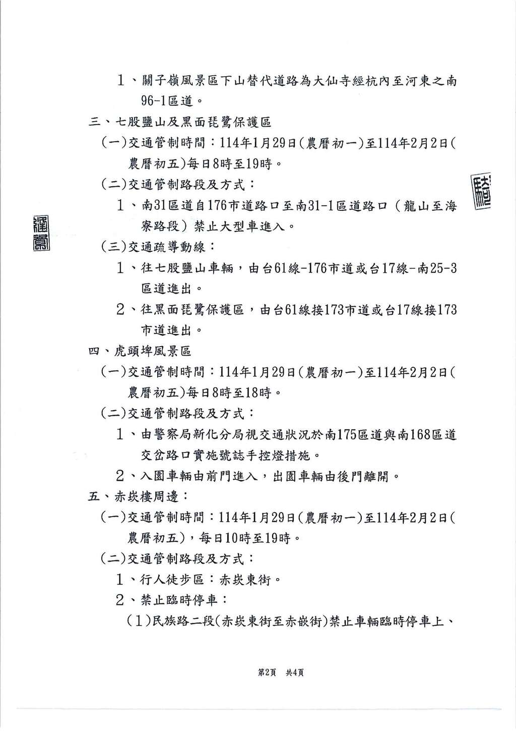 【協助宣導】臺南市114年春節連續假期各風景區聯外道路交通管制公告