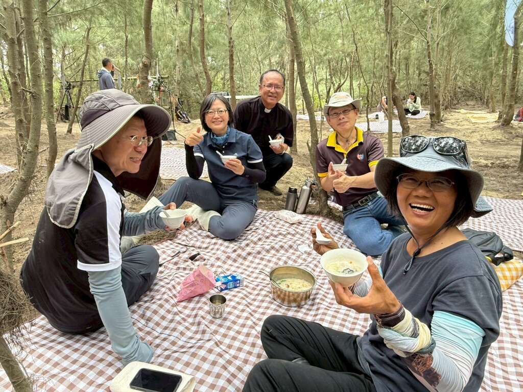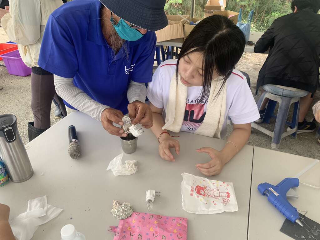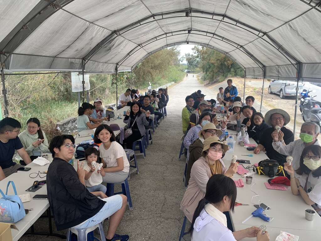 透過藝術創作與環境永續結合的廢棄物美學再生,活動後段,現場也規劃兩場環保手作體驗:「簽名海廢竹片風鈴」與「海廢蚵殼鱟小夜燈」DIY,讓參與者以親筆簽名的竹片裝飾在海廢回收的舊蚵架上,製成隨風搖曳的紀念風鈴;同時認識古生物「鱟」的生態知識,親手打造專屬小夜燈。這些創作不僅延伸海廢物品的生命週期,更在過程中培養參與者的環境意識與地方認同。活動尾聲,在地風味與音樂饗宴結合,為行動畫下美好句點;大家席地於林間野餐,品嘗使用在地食材烹調的鮮美海鮮粥,在徐徐微風與自然林蔭下感受寧靜午後。而特別邀請的音樂創作人網紅「雪絕」現場演唱,亦為此次活動注入青春與活力,也將守護環境的意念轉化為悠揚的旋律回盪林間。