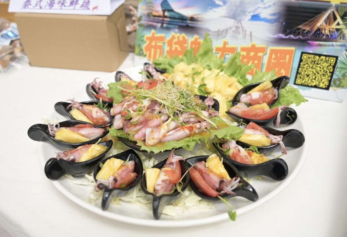 記者會現場由嘉義縣布袋街區觀光發展協會理事長游志豪率領業者展示特色商品,包括新鮮現撈海鮮、香脆魚酥、特製海鹽咖啡及純正蜂蜜等,邀請民眾前來品嚐布袋美味。此外,現場還陳列美容相關相關產品,預告活動將帶來「玩美」新體驗。