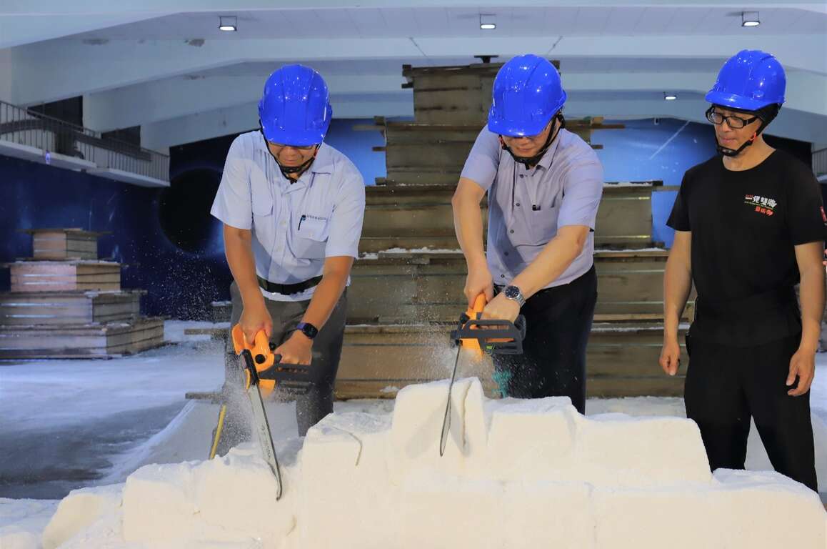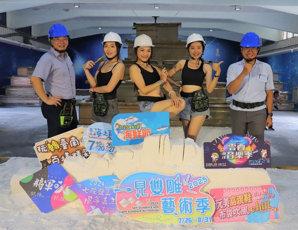 由交通部觀光署雲嘉南濱海國家風景區管理處(以下簡稱雲嘉南管理處)主辦,全臺獨一無二的白色藝術展「2025一見雙雕藝術季」,今(26)日在臺南七股鹽山舉行鹽雕開雕儀式,由雲嘉南管理處徐振能處長、臺鹽實業股份有限公司七股鹽場李俊宏場長與知名鹽雕藝術家陳漢中老師共同在鹽堆上刻劃出三道象徵雲嘉南濱海三區整合共榮的紋路,正式宣告今年藝術季的啟動,也預告雲嘉南濱海一系列精彩的暑期活動即將登場。