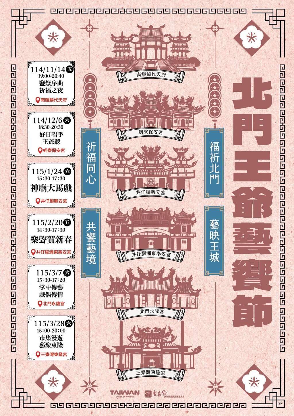 「北門王爺藝饗節」誠摯邀請全國民眾,在歲末年終之際回到北門,一同祈福、走廟、聽歌、逛市集,將今年的願望託付給王爺,並將新一年的幸福與祝福滿載而歸。更多活動詳情及最新消息,請密切關注「雲嘉南,好好玩!!!」粉絲專頁。