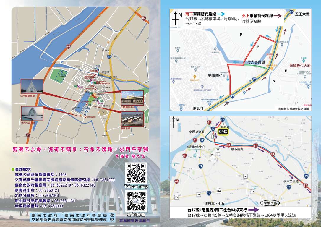 1. 五王大橋因施工道路縮減,請欲前往南鯤鯓代天府旅客於台61線快速道路北門出口下交流道後沿台17線北上前往南鯤鯓代天府,避開施工路段。