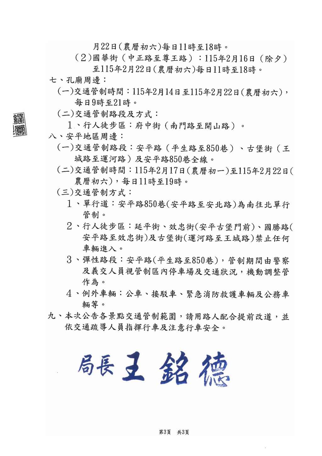 為因應115年春節連續假期大量返鄉及旅遊車潮,臺南市政府針對部分觀光景點周邊道路實施交通管制。