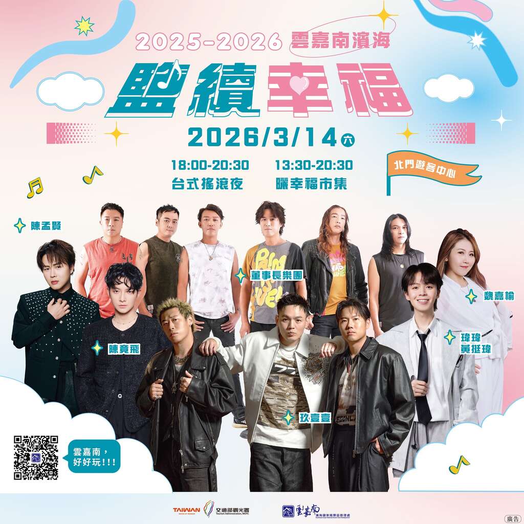 交通部觀光署雲嘉南濱海國家風景區管理處(以下簡稱雲嘉南管理處)將於115年3月14日在臺南北門區北門遊客中心舉辦「鹽續幸福・台式搖滾夜」音樂會,為音樂會系列活動畫下精彩的句點。眾所期待的玖壹壹、董事長樂團、陳孟賢、瑋瑋黃挺瑋、陳竟飛等人氣卡司輪番登場,年節過後活動精彩不間斷,邀請全台樂迷一同感受台式搖滾的熱情魅力。