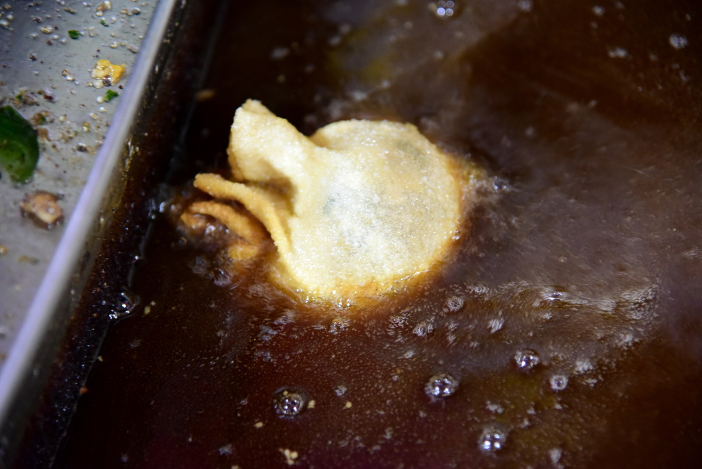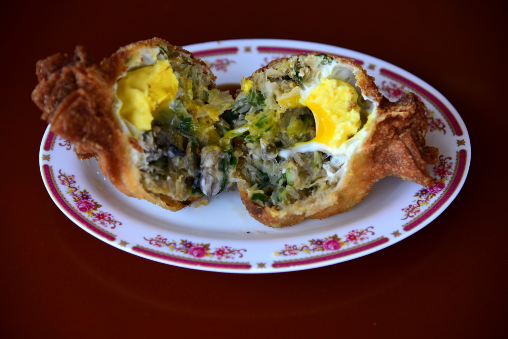 「福袋蚵仔包」在油鍋炸熟後,即可起鍋切塊上桌,沾醬食用。因為油鍋是溫控,所以外皮金黃酥脆,內餡青翠熟軟,一口咬下去,菜香蚵香盈口,有幸福的滋味。由於餡口麵皮凸起,顧客可以直接手持食用,有海口人的粗曠; 至於凸起餡口麵皮稍硬,有顧客不吃,但卻有顧客喜歡那磨牙的嚼勁。